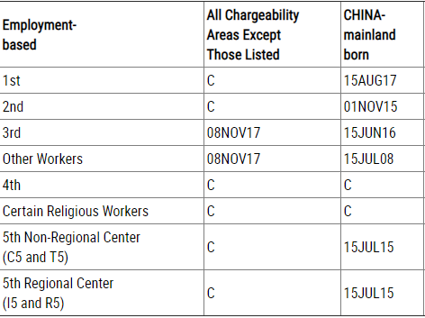 国务院公布的2020年6月绿卡移民排期公布,职业移民多种类型大约一个月的前进幅度。以下是职业移民方面(中国大陆出生申请人)表A审批日期(Action Date):