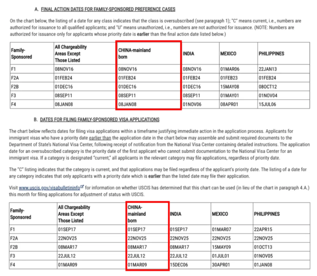 亲属团聚门槛低、覆盖人群广,是普通民众赴美拿绿卡的主流路径。分为直系亲属移民(无配额、无排期)和家庭优先类移民(有配额、需排期)。直系亲属涵盖美国公民的配偶、21岁以下未婚子女、父母(仅美国公民年满21岁可申请);家庭优先类包含美国公民的21岁以上未婚子女(F1)、永久居民的配偶/未婚子女(F2A/F2B)、美国公民的已婚子女(F3)、美国公民的兄弟姐妹(F4)。目前最新亲属移民排期(2025年12月)情况可看下图。