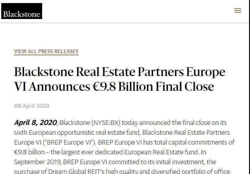 之前总部位于纽约的超级投资管理公司黑石集团发布公告宣称:一项针对欧洲房地产的98亿欧元(合107亿美元)的基金募集计划已经全部完成。作为专注于房地产投资的黑石集团,不可能放过这样的机会,更何况黑石集团曾经在这种"趁人之危"的局势中吃过大甜头。