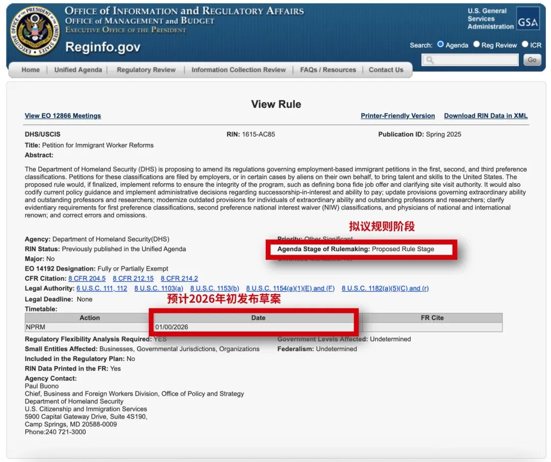 根据2025年春季监管日程(Reginfo.gov)上的官方记录显示,由美国国土安全部(DHS)与移民局(USCIS)共同推进的代号 RIN 1615-AC85 改革计划(Petition for Immigrant Worker Reforms),目前状态为拟议规则阶段(Proposed Rule),计划于2026年初发布草案。